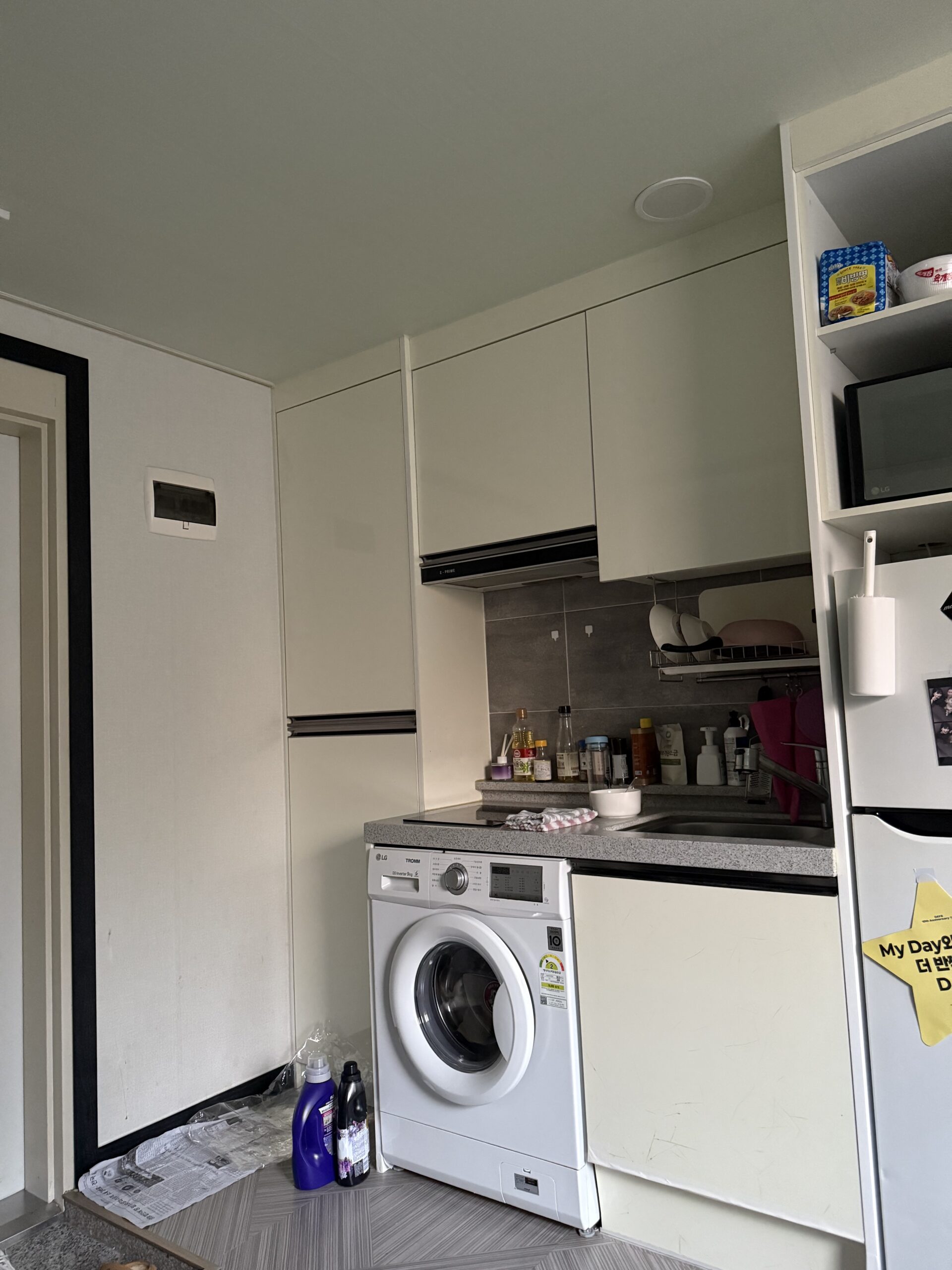 ワンルームです。以前の留学でコシウォンで、共同の空間があってご飯作ろうとしても作れなかったら洗濯機も回せなかったりと色々不便があり、今度は1人で思うようにしたいと思いワンルームにしました