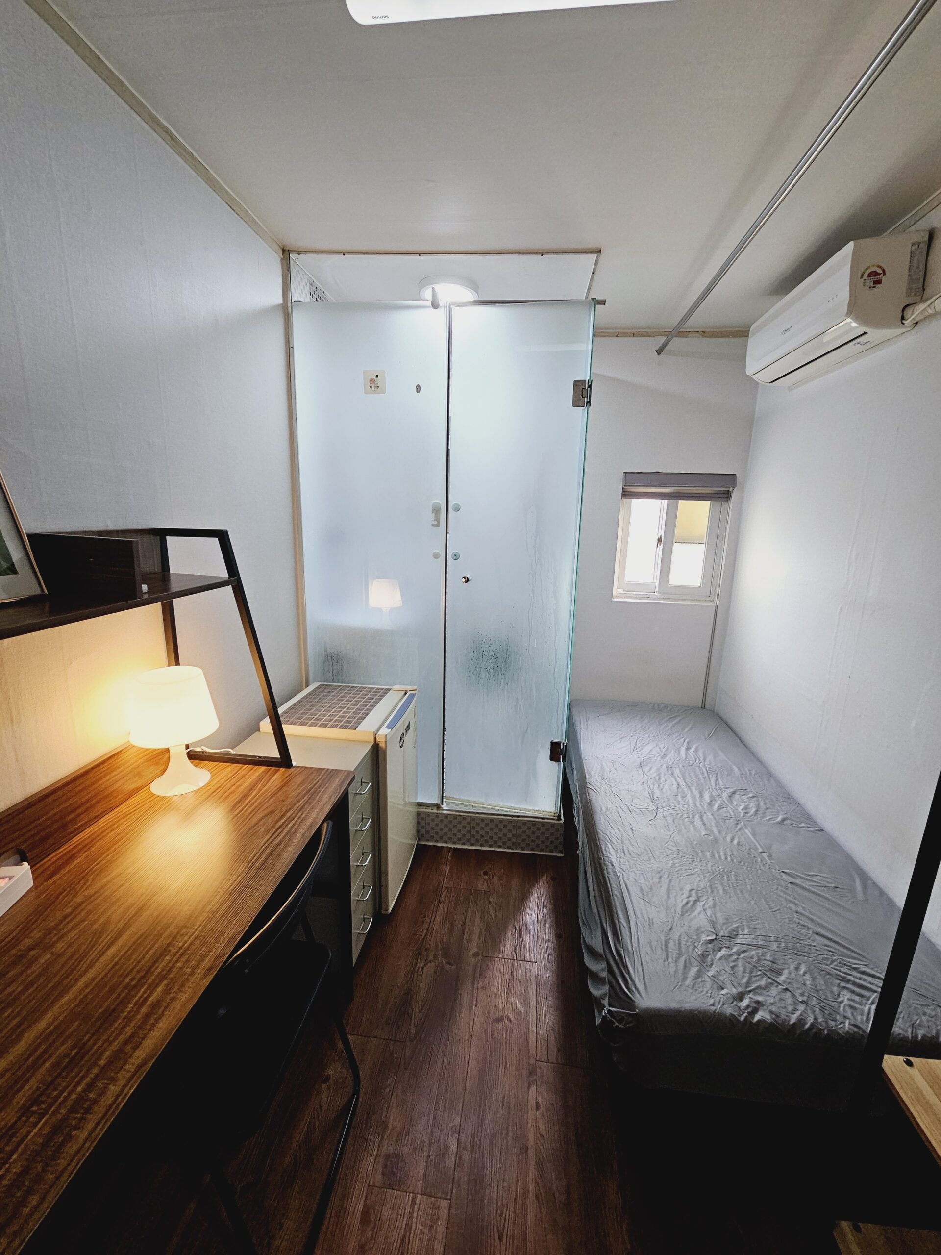 ・個人設備:エアコン、ミニ冷蔵庫、ベッド、机、椅子、クロゼット(ハンガー)、シャワー室(トイレなし)